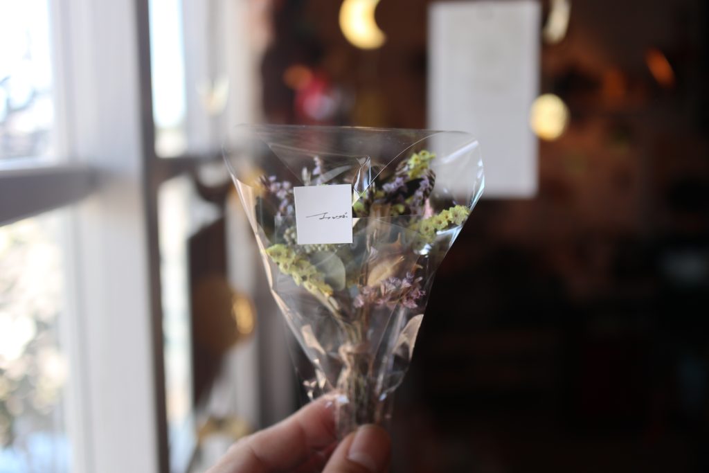 店名にもなっている恐竜モチーフのフラワーベースと、地元・千綿駅の駅舎に店を構える花屋さん「ミドリブ」のスワッグをセットにしました。ギフトに添えるのにも最適のサイズ感です。